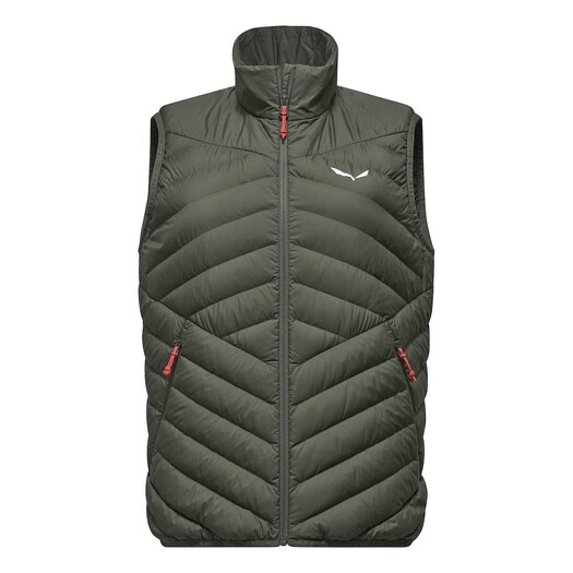 Navdihnjena z Brenta Dolomiti, ta telovnik ima udobno 550 cuin 80/20 RDS-certificirano polnilo iz puha. Njegova matirana zunanja tkanina iz najlona ripstop ima PFAS-prosto DWR-oblogo, ki odbija snežne meteže in rahlo deževje, medtem ko elastični robovi in izrezi za roke preprečujejo vdor ledenih sunkov. Z dvema žepoma z zadrgo za ogrevanje rok.
